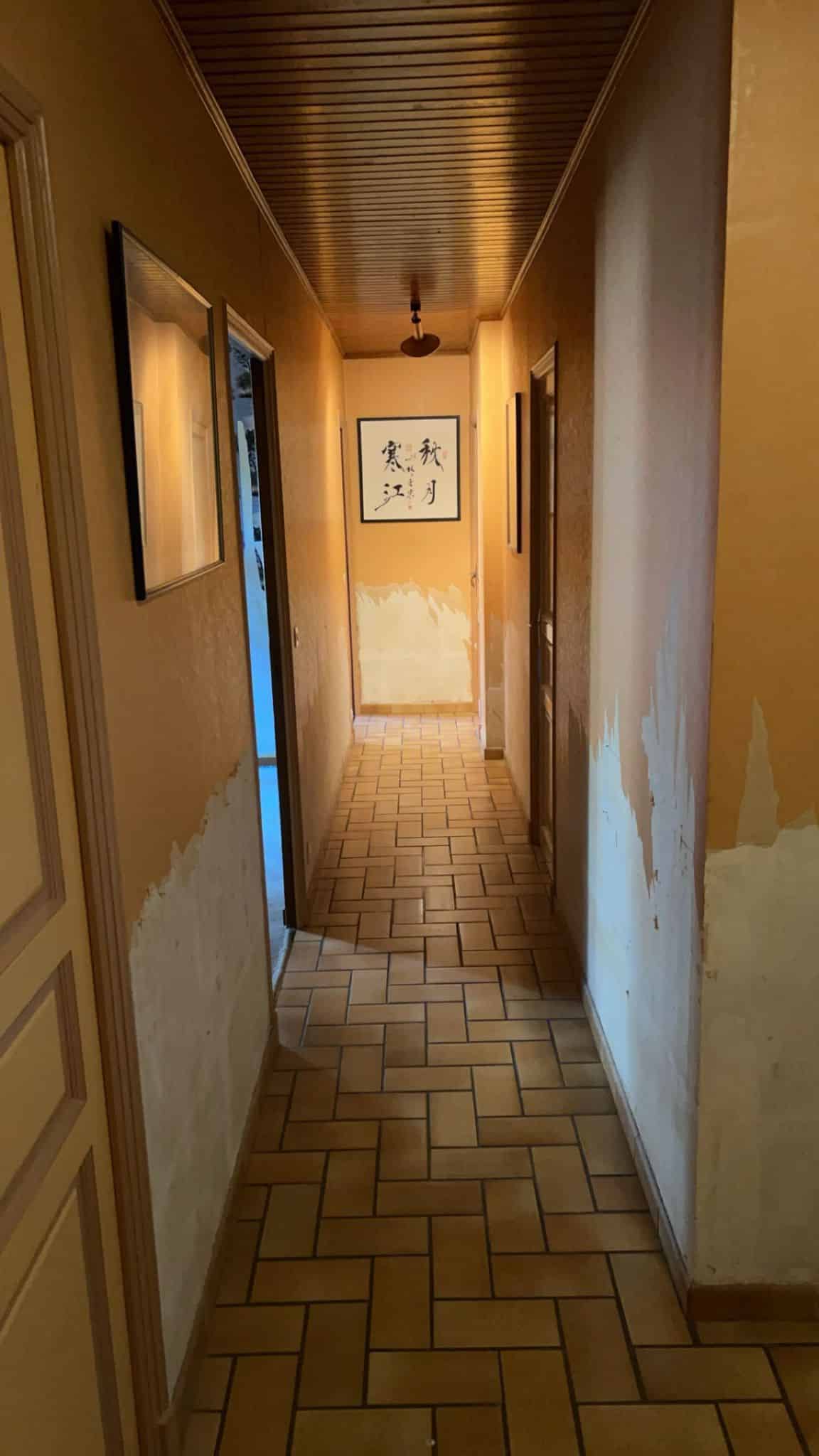 Rafraîchissement complet avec une peinture moderne sur les murs, plafonds et portes. Ainsi, ce relooking transforme l’espace en un couloir à la fois lumineux et accueillant, tout en apportant une touche de modernité et en sublimant le sol en carrelage.