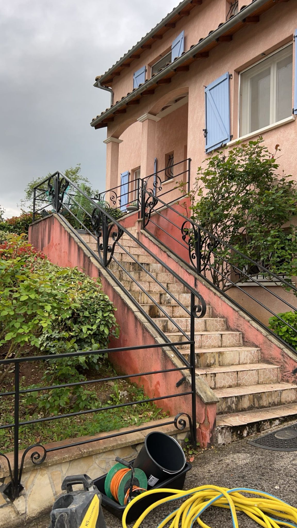 Rénovation complète des escaliers extérieurs grâce à une peinture bleue vive. Ce choix apporte un look rafraîchi et accueillant à l’entrée de la maison, tout en ajoutant une touche élégante de couleur.