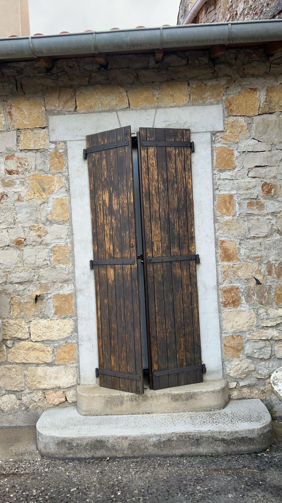 Restauration des volets extérieurs en bois, avec un traitement et une peinture de protection. Ainsi, les volets retrouvent un aspect neuf tout en voyant leur durée de vie prolongée face aux intempéries.