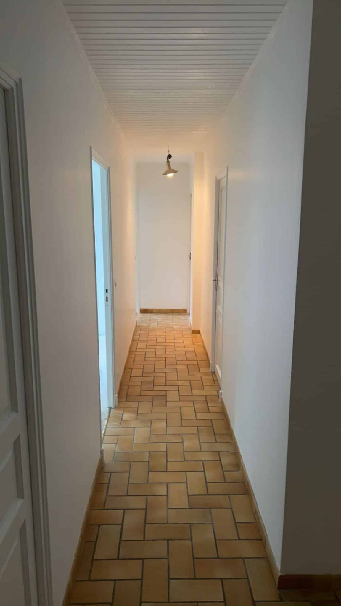 Rafraîchissement complet avec une peinture moderne sur les murs, plafonds et portes. Ainsi, ce relooking transforme l’espace en un couloir à la fois lumineux et accueillant, tout en apportant une touche de modernité et en sublimant le sol en carrelage.