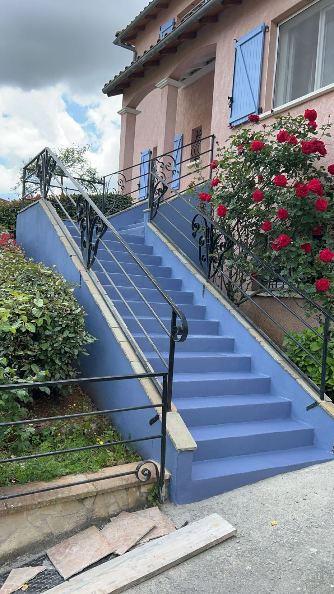 Rénovation complète des escaliers extérieurs grâce à une peinture bleue vive. Ce choix apporte un look rafraîchi et accueillant à l’entrée de la maison, tout en ajoutant une touche élégante de couleur.