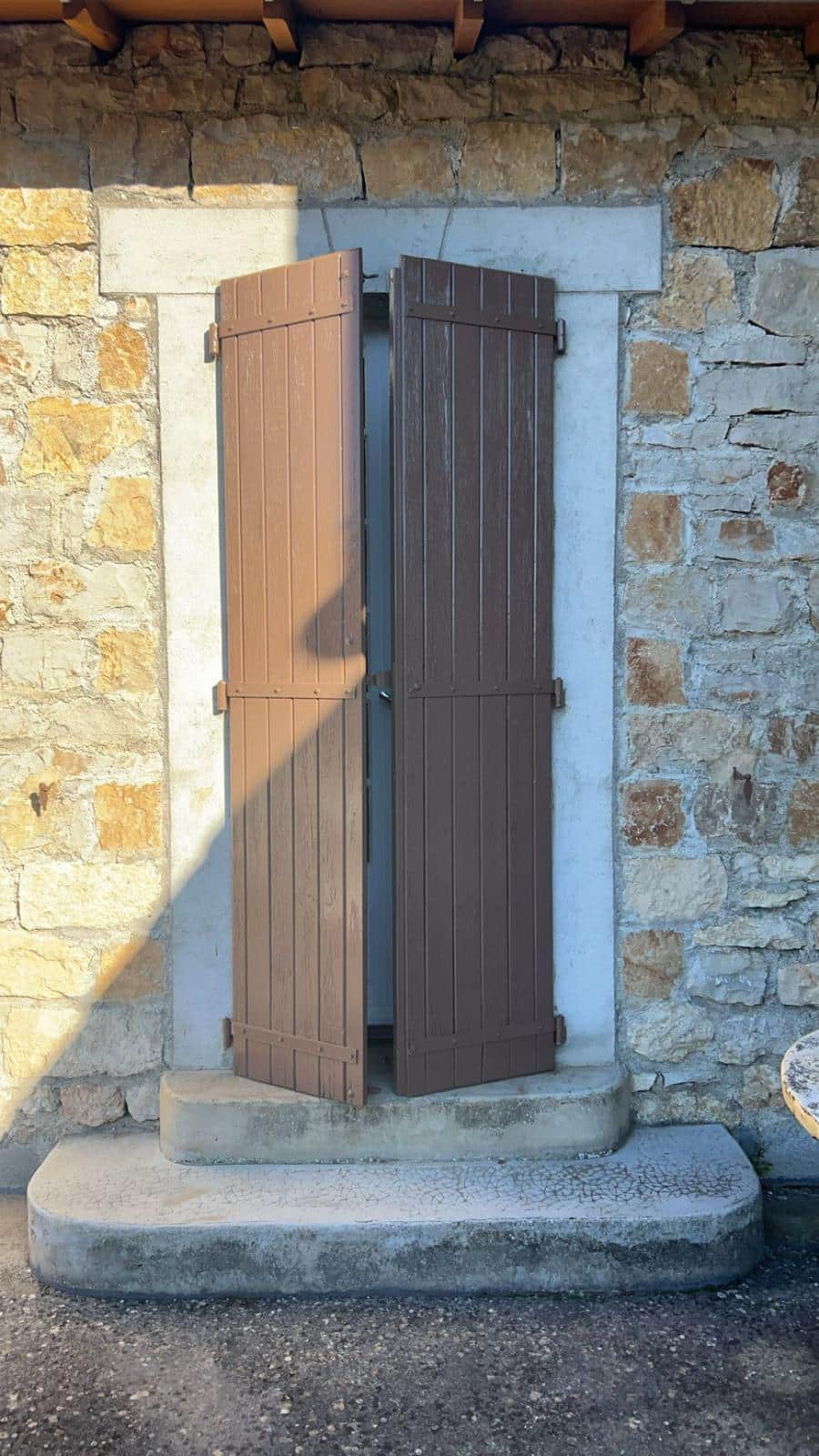 Restauration des volets extérieurs en bois, avec un traitement et une peinture de protection. Ainsi, les volets retrouvent un aspect neuf tout en voyant leur durée de vie prolongée face aux intempéries.